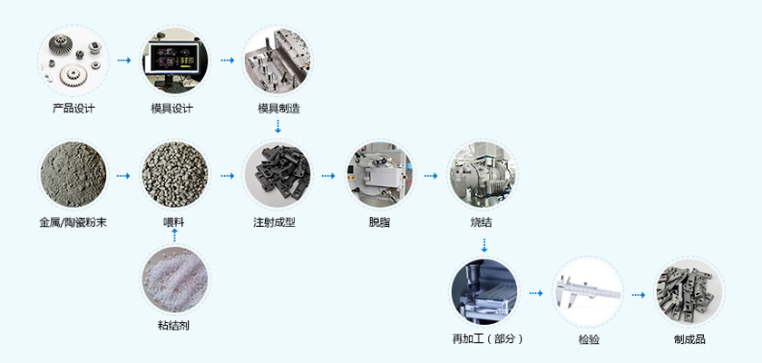 金屬粉末注射成型-將金屬粉末通過與粘合劑混合后利用注塑機(jī)通過成型成我們需要的產(chǎn)品。再經(jīng)過脫脂燒結(jié)緩解制成金屬配件,大大地降低了生產(chǎn)成本,提高了生產(chǎn)效率和產(chǎn)品進(jìn)度。